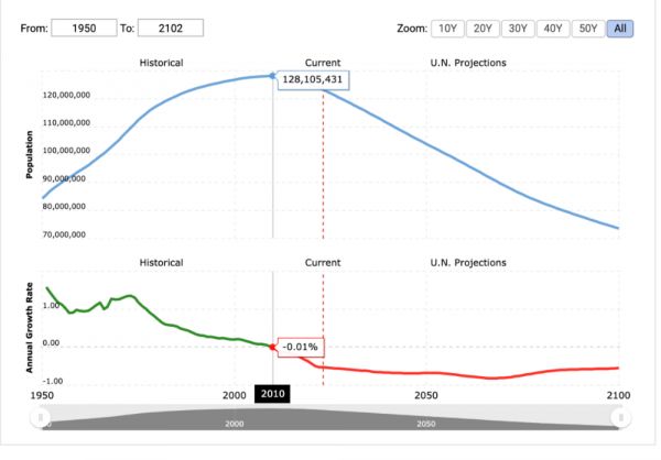 从上图中可以看出,早在2010年日本人口就已经停止增长,随后加速下降,根据联合国的预测,按照目前趋势日本人口将持续加速萎缩。