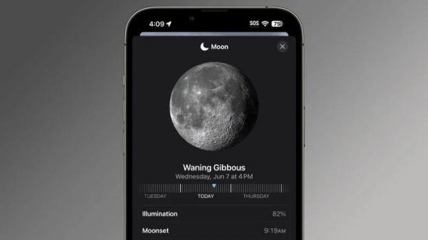 苹果增加了一个月球模块,可以显示月球的当前状态,距离下一个满月的时间,月落和月出时间,以及月历。