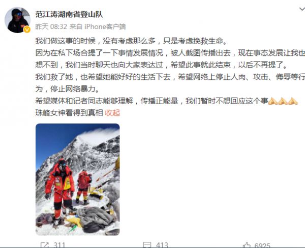 在“珠峰被救女子拒绝支付1万美元救援费用”事件未上热搜之前,事件的双方当事人都是当地媒体报道的英雄人物。湖南省登山队成为今年从南坡登顶珠峰的中国首支省级登山队的消息,也被广泛传播。