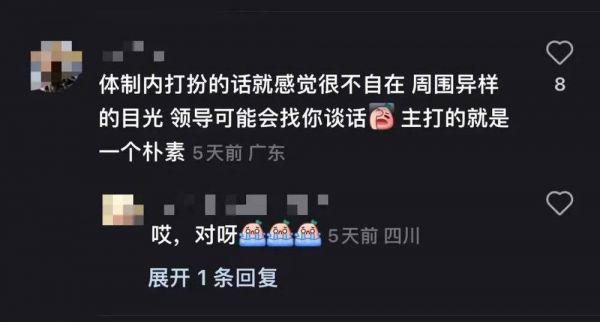 以朴素的面容混入人群,可以给人以一种模糊个人责任,避免独担风险的保障。尤其是初入职场的实习生,或是级别低的基层打工人,在强调集体利益大于个人利益的公司中,与同事的步调保持一致,更可以收获一种隐身其间、不争不显的安稳。