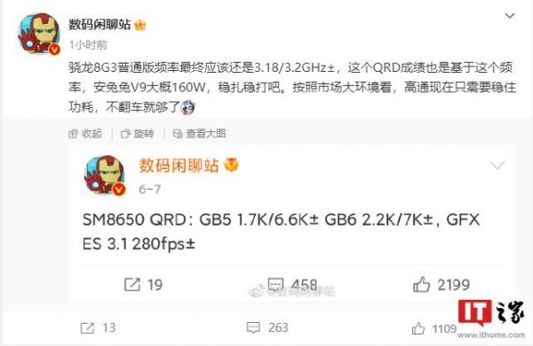 据博主 @数码闲聊站 爆料,骁龙 8 Gen 3 普通版的主频将是 3.18/3.2GHz±,在安兔兔 V9 版本的跑分测试中,能够获得 160 万分的成绩。