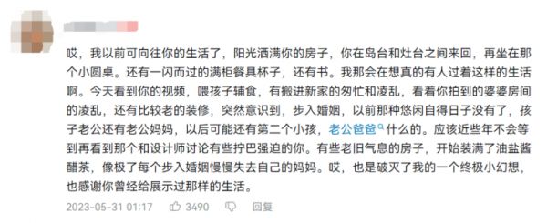 “网络精致生活博主之于普通社畜,类似火柴之于小女孩,你知道那是假的,因为真实的社畜不会在家里放两个多功能锅,买一堆看起来又占地方又难洗的杯盘碟碗,不会动不动就用二十斤水果来熬酱,但你就是会看,因为知道有人能work-life balance能给打工人生活注入名为希望的力量。”
