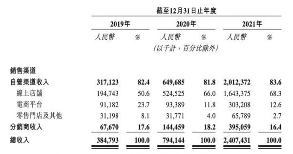 根据招股书,2019年至2021年,蕉下的线上店铺(主要指各种平台如淘宝、抖音上的蕉下官方旗舰店)、电商平台(主要是指各平台的自营业务如京东超市、天猫超市)、零售门店(主要指蕉下的线下直营店铺、合作店铺等)等自营渠道收入分别为人民币3.171亿元,6.497亿、20.124亿元,合计占其同期总收入的超8成;而分销商收入分别为人民币6767万元、1.445亿元、3.951亿元,占同期总收入的比例不足两成。