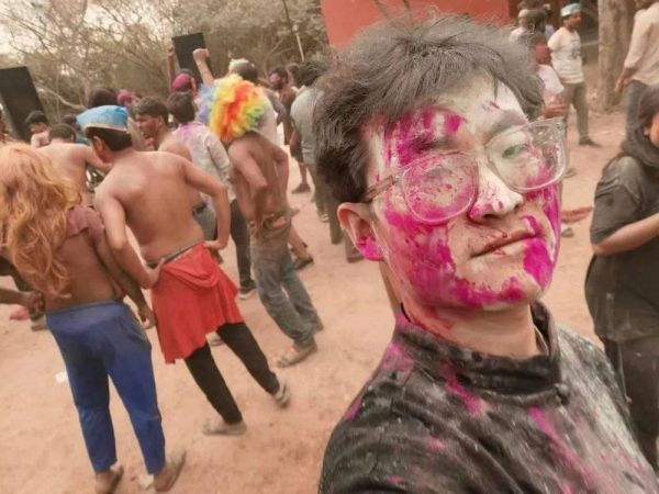 3月赶上印度的洒红节,场面还是很美的。尼大的操场上会用一个大音响放着宝莱坞舞曲,大家都拉着手唱歌、跳舞,穿上精致华美的衣服,会有人往你身上泼水,撒花朵制成的红粉,寓意迎接春天的到来。