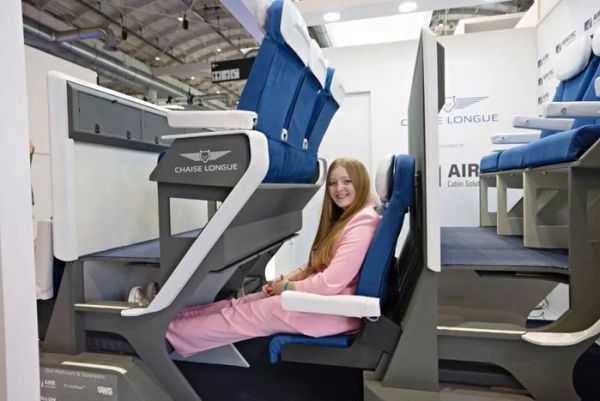 图:AIX 2022上的躺椅飞机座椅的早期版本设计者努涅斯·维森特还改善了顶层的腿部空间。由于同一水平面上没有人直接在你身后,所以你可以将座椅向后倾斜很远,这无疑是一个优势。另外,努涅斯·维森特在顶层座位上方增加了一根横梁,以指示天花板高度。对于只想在飞行期间睡觉的旅行者来说,这可能是一个有效的解决方案。