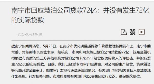 舆情爆发后,到现在南宁将免费停车时长调整为30分钟,取消了非机动车的停放保管费,同时将慧泊公司停止运营,让其接受审查,就目前这些来看南宁政府的响应速度和整改方式还是让人可以接受的。除了停车收费这些事外,有网友翻出了疑似慧泊收取停车费的权利质押给了工商银行贷款了72亿的截图,这件事后被辟谣,是约20亿。