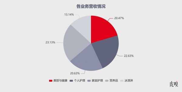 分业务看,联合利华一共有五大业务部门:美丽与健康、个人护理、家庭护理、营养品与冰激凌。其中美丽与健康包括洗发水、护肤品等;个人护理包括牙膏、香皂等;家庭护理的主要品牌有金纺、奥妙等;营养品主要是其食品业务,比如家乐;冰激淋业务旗下有品牌梦龙、和路雪等。