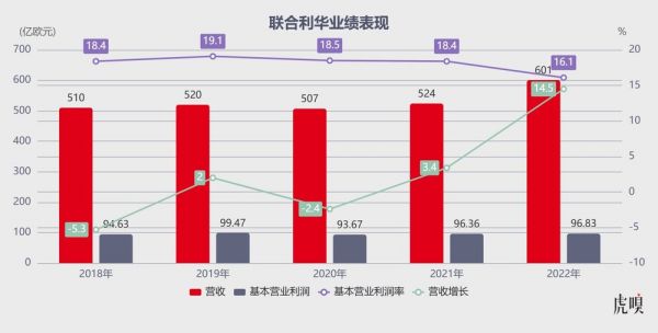 2018年到2021年,公司营收基本维持在510亿欧元—520亿欧元左右,增长缓慢。2022年,联合利华的营收增长14.5%,达601亿欧元。看似业绩比前几年猛了,但其实主要是涨价在驱动。
