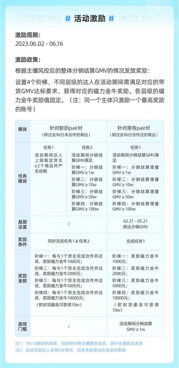 具体而言,对于新的商达pair对,达人需在活动期间上架2个及以上的指定货主商品并产生动销,新老商达pair对活动期间分销结算GMV达到1万及以上,即有机会获得1000元-10万元不等的磁力金牛奖励,以此激励不同层级达人,在大促期间再创新高。除此之外,快手电商还向商家、达人们开放了商品佣金机制等权益,助力无货主播在大促期间拿到优质商品,冲击618,满足更多粉丝的消费需求。