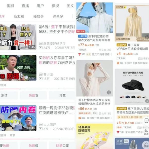 在社交平台和电商平台上,“蕉下同款”、“蕉下平替”、“蕉下代工厂”等各种山寨商品,风头很大。