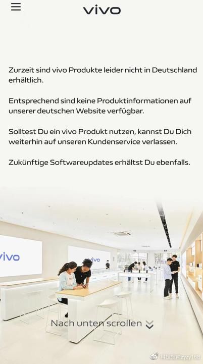 根据vivo德国官网5月30日的消息,vivo已决定暂时停止在德国市场销售产品。vivo德国官网显示:“不幸的是,vivo产品目前在德国无法获得,因此,我们的德国网站上没有产品信息。如果您使用的是vivo产品,您仍然可以依靠我们的客户服务,您还将收到未来的软件更新。”