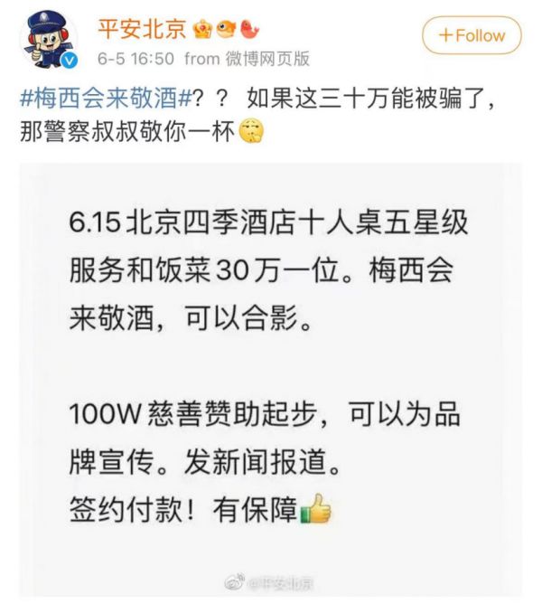 与此同时,“黄牛”大行其道,据传最贵的门票已被炒至4万元以上,而传说中能够让“梅西敬酒”的五星级饭店晚宴席位价格更是高达6位数。北京市公安局的官方微博账号“平安北京”因此亲自下场,发微博提醒各位球迷不要被骗。