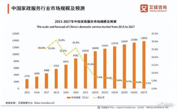 据艾媒咨询统计显示,从2015年到2021年,中国家政服务市场规模由2776亿元增至10149亿元,增长近4倍,预计2023年将达到11641亿元,从业人员超过4000万人。