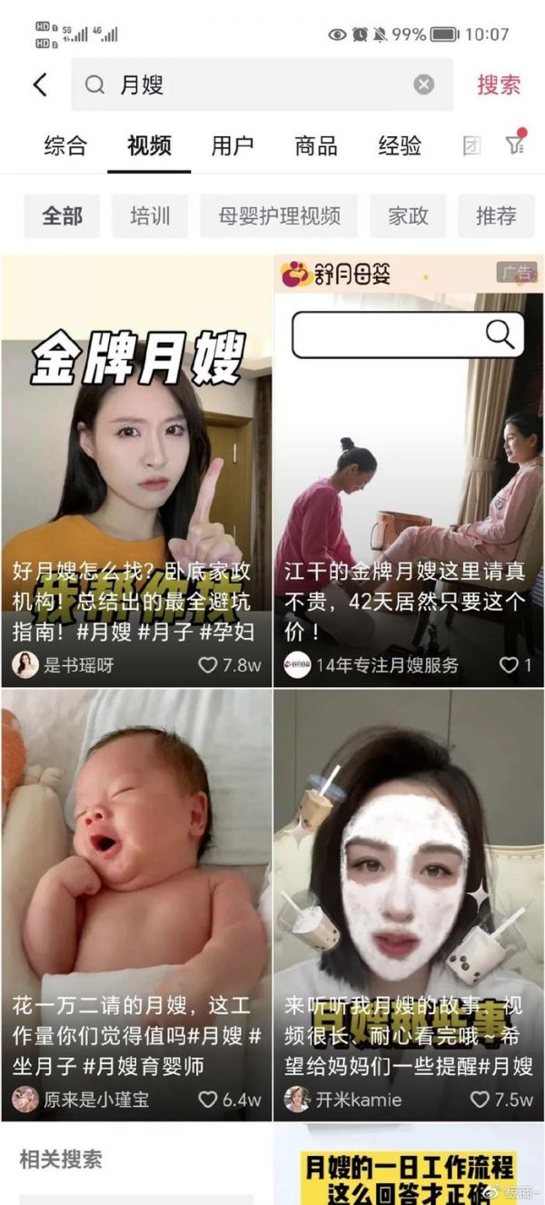 例如,在抖音上搜索“月嫂”,会出现不少育婴师、月嫂的个人账号,其中不乏粉丝数超过50万的账号。另外,还会出现一些家政公司或家政培训机构的官方账号。