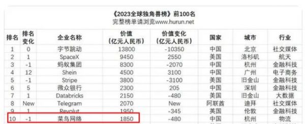 在胡润《2023全球独角兽榜》中,菜鸟估值达到1850亿元。目前,京东物流市值为837亿港元,顺丰市值为2353.61亿元人民币。这意味着菜鸟一旦上市成功,市值很可能超过京东物流。