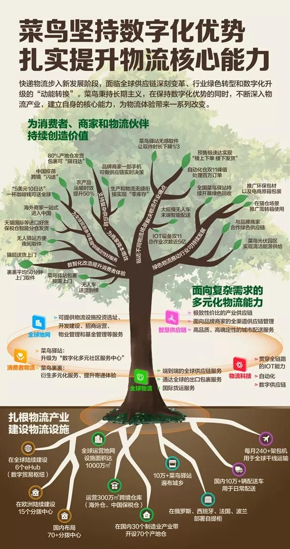 此外,菜鸟还在全球布局6大智慧物流枢纽,海外分拨中心15个,覆盖全球近200个国家及地区。