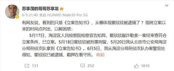 发布翟欣欣被逮捕的消息后,苏享茂的哥哥苏享龙再次通过微博进行了详细解说。2023年5月17日,苏享龙被海淀区人民检察院检察官告知,翟欣欣敲诈勒索一案经审查符合立案条件,已立案。5月18日翟欣欣被刑事拘留,5月20日其从北京市公安局海淀分局刑侦支队拿到《立案告知书》。6月5日,从海淀分局刑侦支队办案警官处得知,翟欣欣已被逮捕,羁押在看守所。
