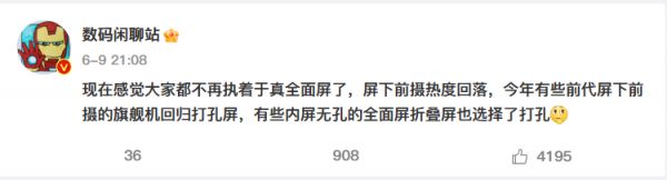 就在近日,知名数码爆料博主@数码闲聊站发博称,屏下前摄的热度已经逐渐消失,很多之前以屏下摄像头为卖点的产品也将回归主流挖孔屏设计。