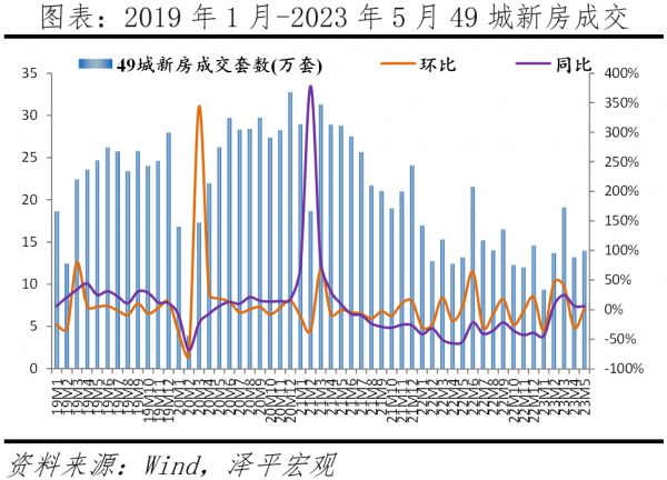 2023年4、5月,49个样本城市新房分别成交13.7、14.0万套,基本持平,环比分别变化~28.7%、+2.0%,较2、3月环比涨幅明显下滑,较往年同期成交乏力;同比分别变化10.2%、6.1%,低于3月25.5%的同比涨幅。