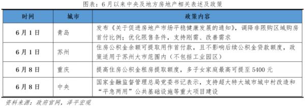 6月以来,事情正在起变化。青岛、苏州、重庆对楼市政策进行调整,6月1日,青岛打出楼市新政组合拳,涉及限售放松、非限购区域首付比例调整、棚改货币化安置和房票政策等内容;苏州公积金账户余额可提取用于支付首付,同时提取余额以后并不影响公积金贷款额度等。