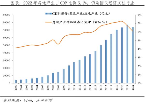 (一)房地产是国民经济的第一大支柱,2022年房地产业增加值为7.3万亿元,占GDP的6.1%