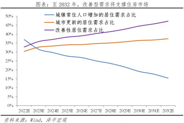 改善性需求总量、占比均呈现逐年增长趋势,2023年后有望超越城镇常住人口增长带来的需求成为最大的需求。