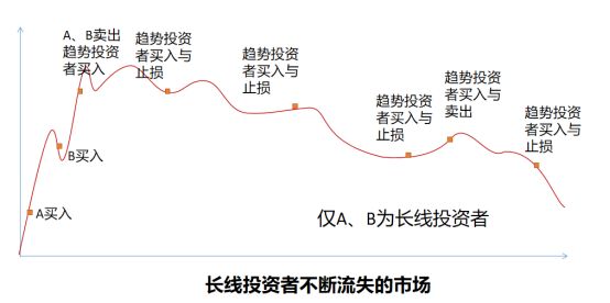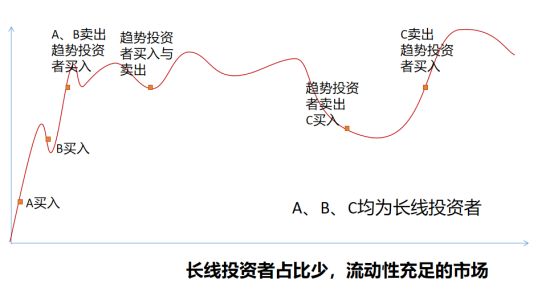 与长线投资者对应的是趋势交易者,只是“投票器”,没有长期定价能力。如果一个市场的长线投资者不足,趋势投资者比重过大,我们可以想象一个基本面发生好转的公司,在股价上涨到一定程度后,趋势投资者就会介入,这一类资金一是买涨不买跌,二是没有估值的判断,最终的结果就是股价的上涨大幅超越了基本面,最后形成前面的B走势。