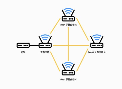 Mesh组网分为有线、无线和混合组网三种方式。尽可能多地用有线Mesh组网,有线传输稳定性最好,且不受信号衰减的影响。(无线组网下,可以选“三频”路由器,留出一个专门的频段用来组网,最大程度不影响网速。)