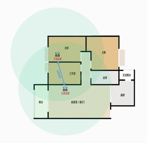 我家近100平,结构如下。我将主路由放到客厅,子路由放到次卧。因为次卧没有预埋通往客厅的网线,与主路由之间是无线传输。我明显能感到,信号在穿透两堵墙之后,有了很大损耗,最多只能跑150兆左右,且存在了信号死角。