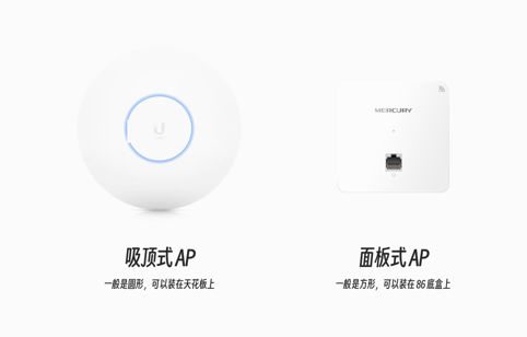 根据AP的外观和安装位置,通常可以分为两类:吸顶和面板两种。前者就像吸顶灯一样附在天花板上;后者可以隐藏在86面板中。