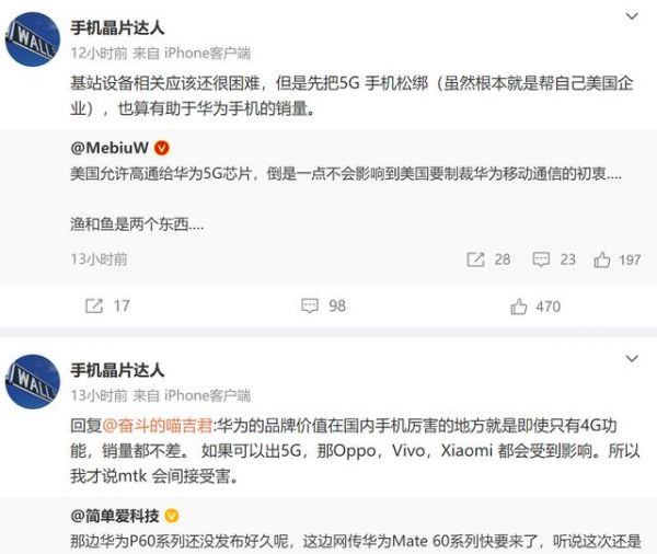 博主@手机晶片达人表示,美国允许高通给华为5G芯片,一点也不影响其本意,不过基站设备相关应该还很困难,但是先把5G 手机松绑(虽然根本就是帮自己美国企业),也算有助于华为手机的销量。