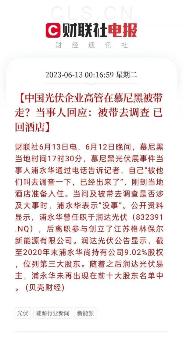 中国光伏企业高管在欧洲被带走调查?当事人深夜回应