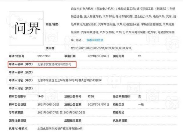 国家知识产权局商标局信息显示,此次转让给华为技术有限公司商标的企业为北京永安世达科贸有限公司,其于2021年2月4日申请了问界的12类、9类商标,截至目前已经布局了17枚问界商标。