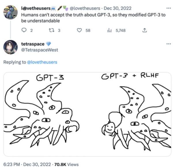 画面左边是一只手绘风格的修格斯,上面写了“GPT-3”;画面右边是同样的一只修格斯戴上了一个笑脸面具,上面写了“GPT-3+RLHF”。简单来说,这张讽刺漫画想表达的意思就是,人工智能语言模型就像一头未知的恐怖怪物。为了让他表现得友善和无害,人工智能公司不得不给它戴上了微笑的面具。