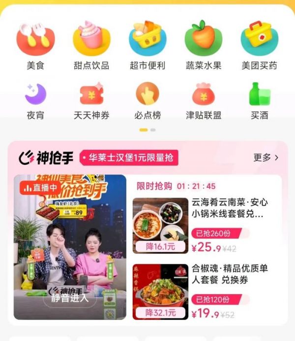 ▲(北京地区的美团外卖“神抢手”入口。图源/美团外卖APP)4月18日,美团宣布全面升级“神券节”营销活动,同样也是通过直播形式面向用户进行营销推广,发放多品类大额优惠券。5月份,该活动参加的商家和类别进一步增长。