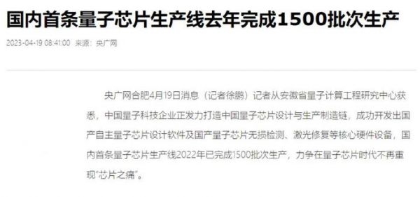 但是,当中国企业不仅制造出了自己的光刻机,而且在量子芯片和光子芯片方面实现了“弯道超车”,互联鱼注意到央视报道消息记载,2023年4月份中国国内首条量子芯片生产线已经实现了1500批次的生产制造。