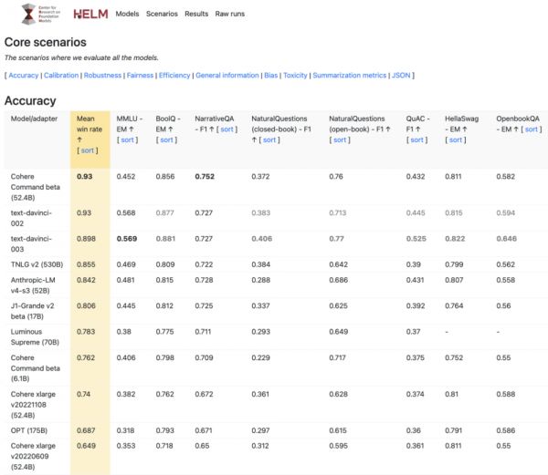 在模型技术表现方面,斯坦福大学的 HELM 语言模型评估显示,Cohere 的最新模型 Command 有 520 亿个参数,这是 Cohere 模型的最大版本,其准确性表现高于多个规模为 3 倍更大的知名模型,包括有 1750 亿个参数的 GPT-3。