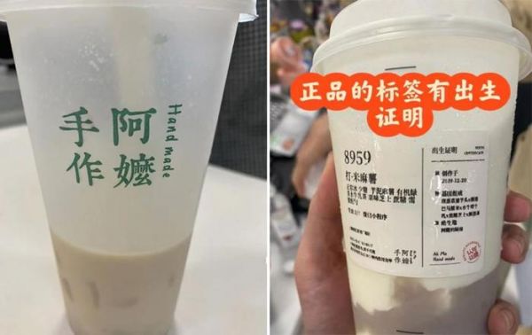 左为“阿嬤手作”的外包装,右边为正版的“阿嬷手作”经同事提醒,杨先生发现,“阿嬤手作”奶茶杯的外壁上写的是 “阿嬤手作”,且字体与图案和正版“阿嬷手作”有明显不同。从奶茶的标签来看,正版“阿嬷手作”会贴上标注奶茶原料产地的“出生证明”,而“阿嬤手作”仅仅只是奶茶名称等。“这才意识到自己买到了李鬼版的”。
