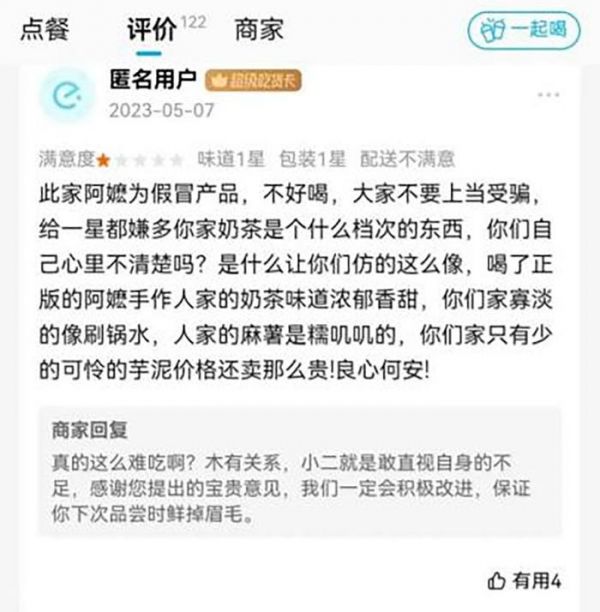 对此,“阿嬤手作”却回复:“我想请问你,奶茶不都是人做出来的吗?哪里存在真的和仿的,你如果觉得口味有问题我能接受。”就此纠纷,澎湃新闻近日向饿了么客服反馈“阿嬤手作”系盗版,客服称会移交给相关部门处理。