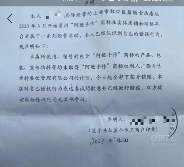 澎湃新闻随后了解到,目前“阿嬤手作”已在饿了么店铺界面上发布致歉声明称,使用、销售的包含“阿嬷手作”商标的产品、包装、宣传物料等均未取得“阿嬷手作”商标权利人广西手作幸村餐饮管理有限公司的许可,目前已全部下架并销毁,对侵权行为表达真诚的歉意并已经做好赔偿。