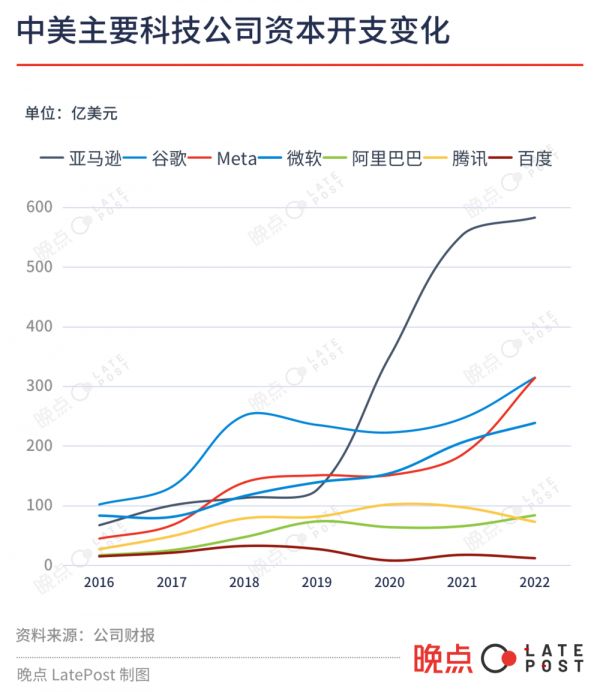 疫情三年中,海外公司资本开支继续上涨。亚马逊去年的资本开支已来到 580 亿美元,Meta、Google 均为 314 亿美元,微软接近 240 亿美元。中国公司的投资在 2021 年之后则在收缩。腾讯、百度去年的资本开支均同比下滑超 25%。