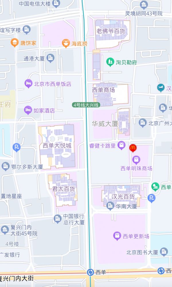 西单北大街两侧分布着多座著名商厦 图片来源:百度地图