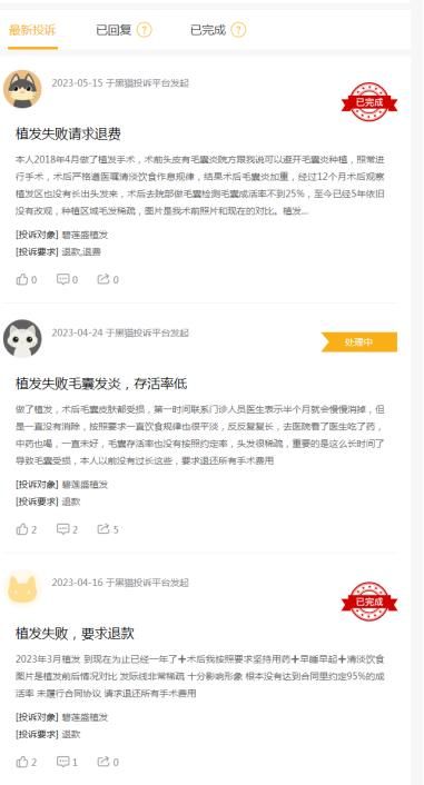 作为全国连锁的碧莲盛,也被认作是行业头部玩家,我们在黑猫投诉上也看到不少关于其的投诉内容。投诉方向包括欺骗消费者、退款问题、虚假宣传,有消费者反映自己观察植发区没有长出头发来,术后去院部做毛囊检测毛囊成活率低,说好的医生并没有给自己做手术,到头来换大夫了。还有反映售后问题的,由于身体原因无法进行手术,迟迟不肯退款的。整个看下来大部分其实还是集中在植发失败上面。