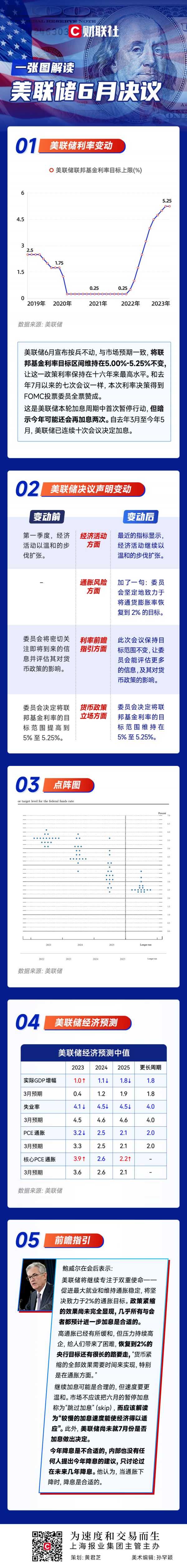 北京时间6月15日凌晨02:00,美联储联邦公开市场委员会(FOMC)发布了最新的利率决议,与市场预期一致,将联邦基金利率目标区间维持在5.00%~5.25%不变。在连续加息10次之后,美联储终于停下了脚步,但暗示今年可能还会再加息两次。
