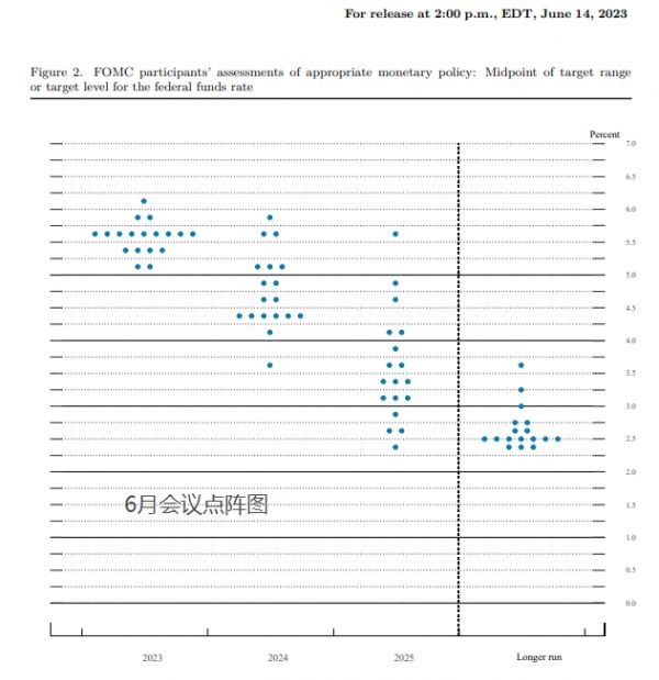 美联储FOMC 6月点阵图显示,2023年年底利率预期中值为5.6%,此前为5.1%。这预示着今年还要加息50个基点,也就是还会有两次加息。