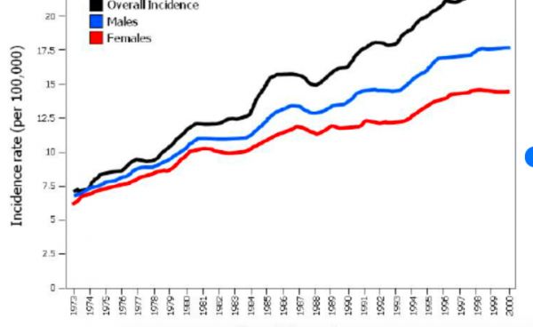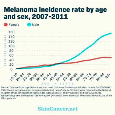 上图为美国黑色素瘤与年龄相关,下图为从1972至2000年间,黑色素瘤的发生率变化趋势
