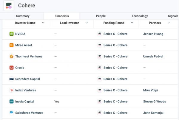 英伟达、甲骨文和Salesforce都在押注Cohere,图片来自Crunchbase