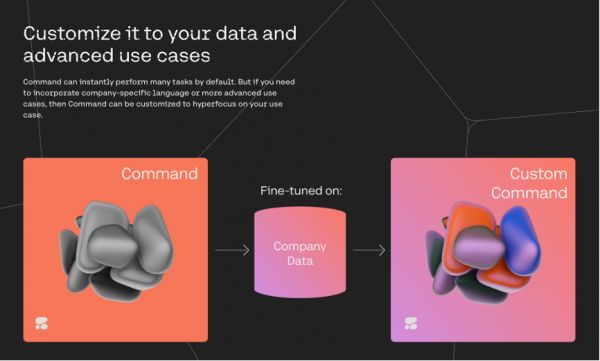 下面,再重点介绍一下Command Model。Command是Cohere推出的一个能够接受用户个性化命令训练的文本生成模型。也就是说,企业用户在将自己的数据和Command结合之后,就可以产生一个自己独有的语言模型,能够在企业的实际业务中立即发挥作用。