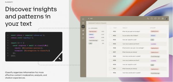 对于希望构建自己的文本分析应用程序的机器学习团队,Embed可以帮助他们快速发现趋势,并支持100多种语言。Semantic Search是一个强大的搜索工具,用户只需要简单使用API,就可以使用该搜索功能,能够支持基于查询的含义而不仅仅是关键词来返回多种信息,并且不受语言的限制。Rerank可以基于语义相关性分析现有工具的搜索结果并进行排名,从而提供更丰富、更相关的结果,且对用户的干预或编程经验要求很小。