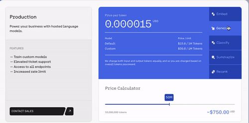 从价格来看,嵌入功能下,默认模型每 100 万个Token 40 美分,企业自定义的模型80 美分,生成功能下,默认模型每100万个Token 15美元,自定义模型30美元,总结功能下,每100万个Token15美元等。